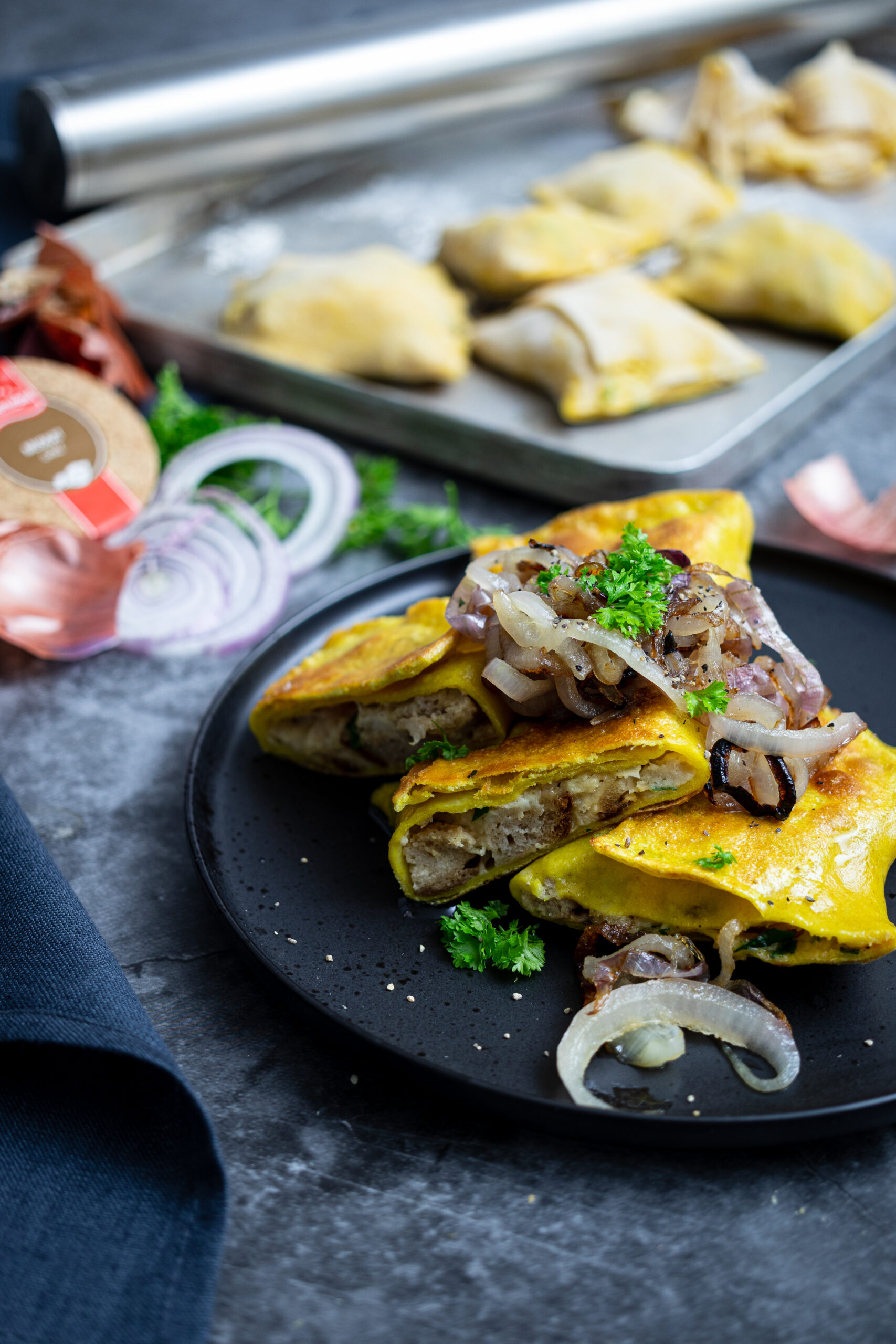 Ja, der Teig kann ohne Ei zubereitet werden und die Füllung lässt sich mit pflanzlichen Alternativen wie Hafercreme und veganem Käse umsetzen.