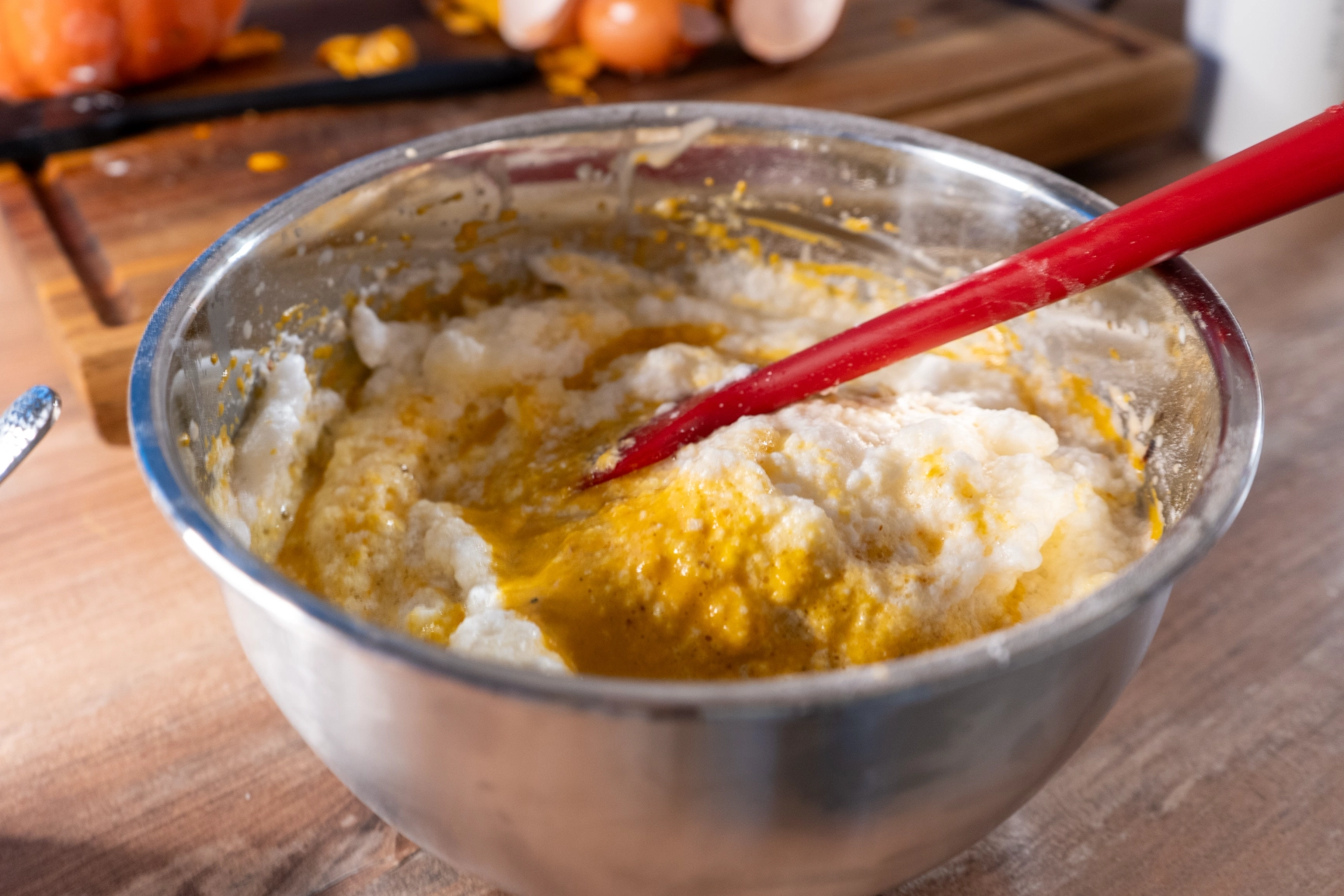 - Die Eier trennen. Eiweiß mit einer Prise Salz zu steifem Schnee schlagen. Eigelb mit Zucker schaumig rühren, anschließend das Kürbismus hinzufügen und zu einer glatten Masse verrühren. Zimt, Mehl und Milch dazugeben und sorgfältig einrühren. Zum Schluss den Eischnee vorsichtig unterheben, damit der Teig luftig bleibt.