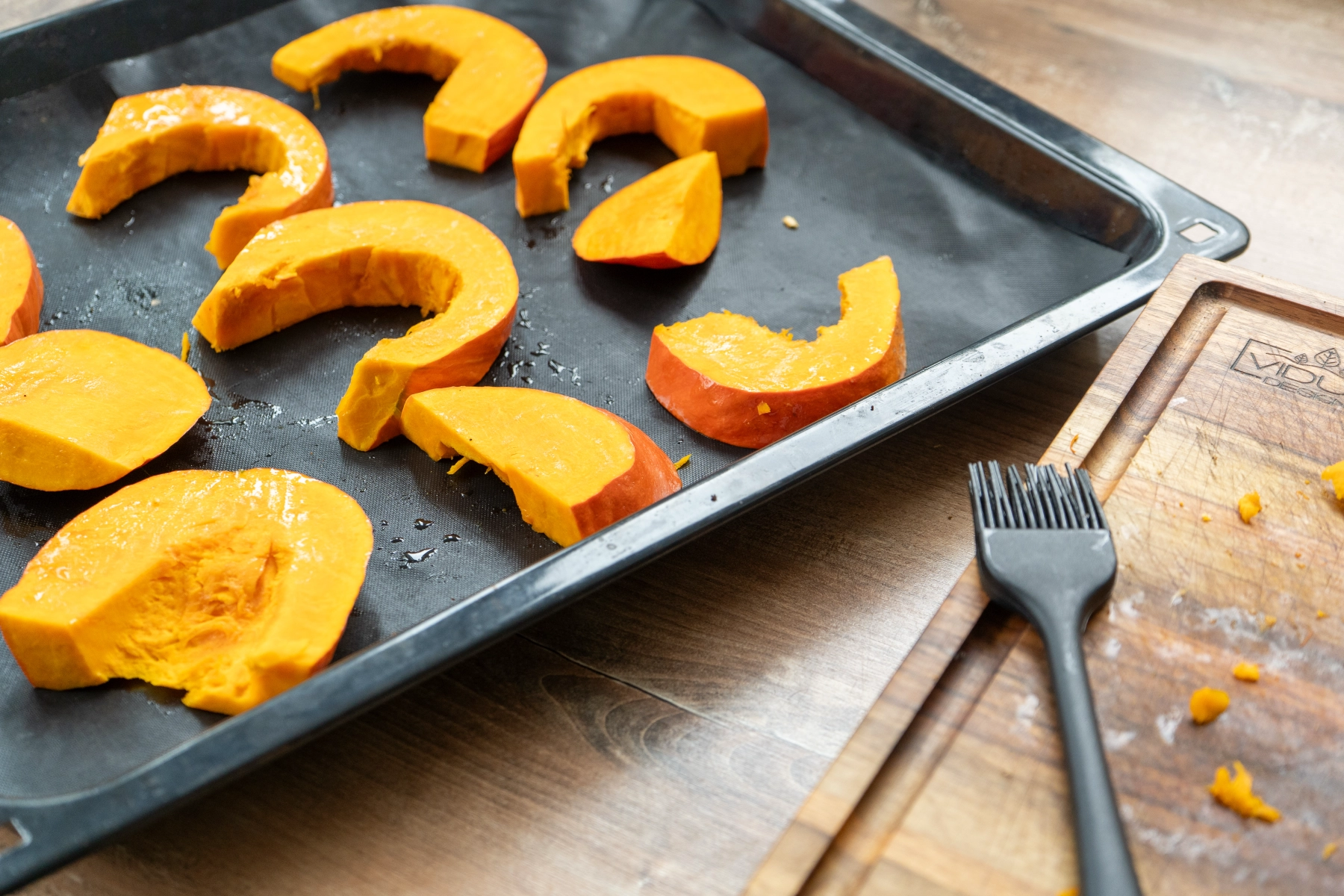 * Kürbismus herstellen: Hokkaido-Kürbis halbieren, Kerne entfernen, in Scheiben schneiden und im Ofen (175 °C Umluft, ca. 30 Minuten) weich garen. Anschließend fein pürieren. Das Kürbismus kann auch eingefroren werden.