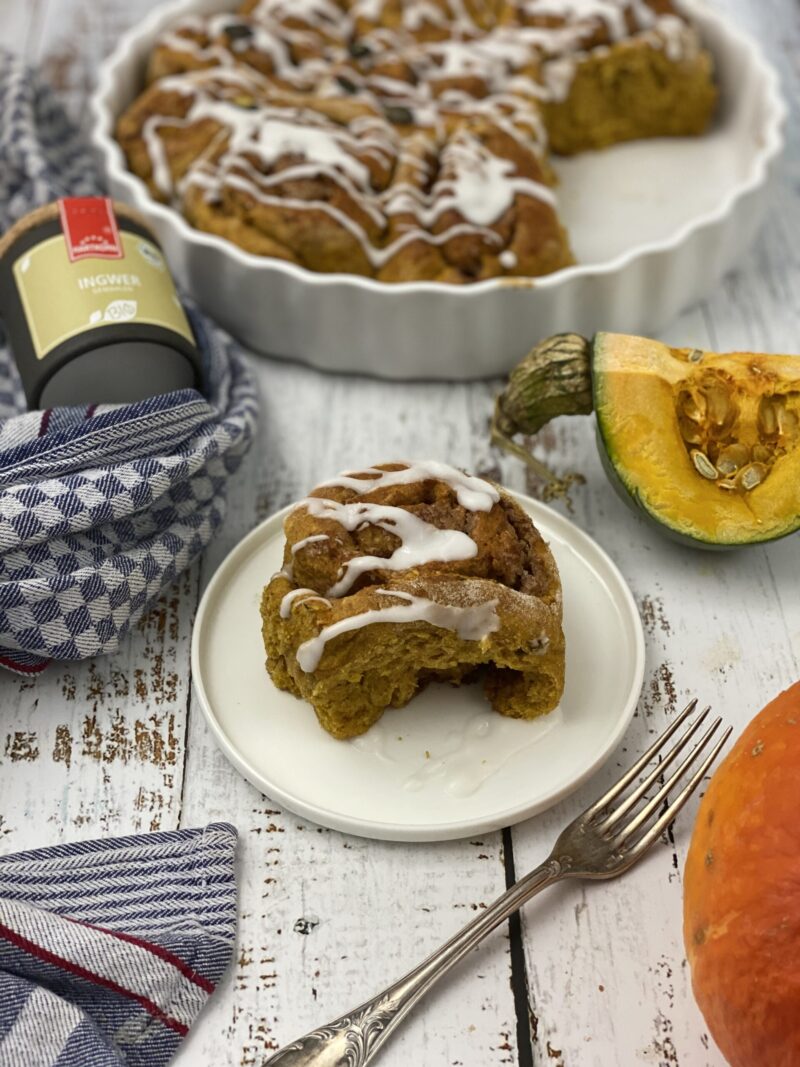 Nachdem backen hat man zwar schon Lust direkt hineinzubeißen, man sollte sie aber kurz abkühlen lassen, sonst zerfließt der Zuckerguss zu sehr. Für die Zuckerglasur einfach den Puderzucker mit knapp 2 EL heißem Wasser verrühren, bis eine zähflüssige Paste entsteht. Die Glasur nun über die Zimtschnecken mit Kürbis geben, kurz antrocknen lassen und servieren.